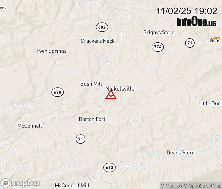 On Rt. 1205 North in the County of Scott, in the vicinity of Nickelsville Hwy; VA-71E/W, motorists can expect delays due to a vehicle crash. Lane closures exist. ![]() |