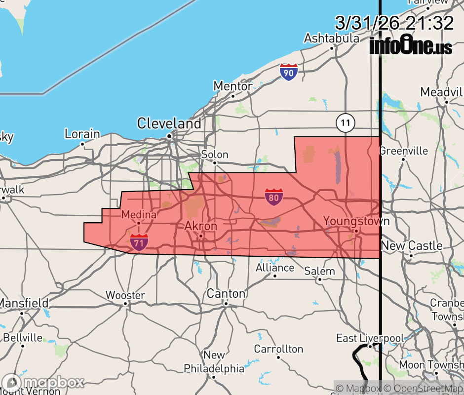 Canceled 4/1/26 1:00 AM Flood Advisory issued March 31 at 9:31PM EDT until April 1 at 1:00AM EDT by NWS Cleveland OH * WHAT... Flooding caused by excessive rainfall is expected. * WHERE... A portion of northeast Ohio, including the following counties, Mahoning, Medina, Portage, Summit and Trumbull. * WHEN... Until 100 AM EDT. * IMPACTS... Minor flooding in low-lying and poor drainage areas. * ADDITIONAL DETAILS... - At 931 PM EDT, Doppler radar indicated heavy rain due to thunderstorms. Minor flooding is ongoing or expected to begin shortly in the advisory area. Between 0.5 and 1.5 inches of rain have fallen. - Additional rainfall amounts of 0.5 to 1.5 inches are expected over the area. This additional rain will result in minor flooding. - Some locations that will experience flooding include... Akron, Youngstown, Warren, Medina, Ravenna, Cuyahoga Falls, Boardman, Brunswick, Kent, Barberton, Solon, Hudson, Wadsworth, Niles, Twinsburg, Tallmadge, Streetsboro, Macedonia, Campbell and Hubbard. - Please visit www.weather.gov/safety/flood for flood safety and preparedness information. ![]() |