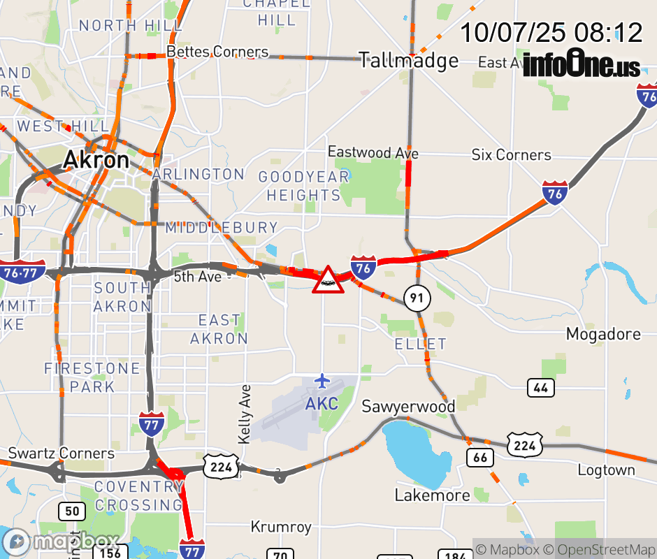 The right shoulder is blocked on I-76 West beyond SR-18/E Market St, due to a crash. Updated: Tue 10/7/25 8:12 AM EDT ![]() Updated: Tue 10/7/25 8:12 AM EDT |