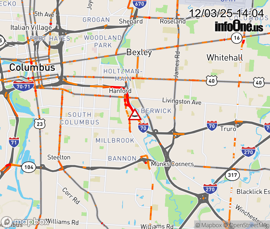 The 2 right lanes are blocked on I-70 East beyond Alum Creek Dr/Livingston Ave, due to a crash. Updated: Wed 12/3/25 2:04 PM EST ![]() Updated: Wed 12/3/25 2:04 PM EST |