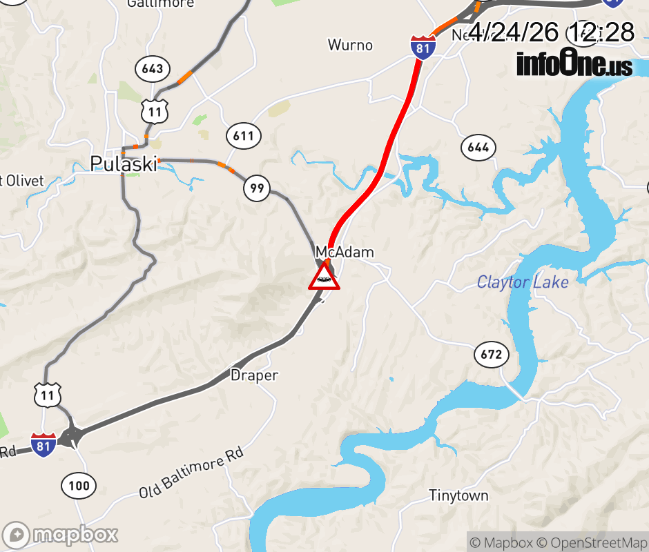 On I-81 at mile marker 94.3 in the County of Pulaski, motorists can expect delays due to a multi-vehicle crash. The south left shoulder and left lane are closed. Traffic backups are approximately 2.5 miles. Updated: Fri 4/24/26 12:28 PM EDT ![]() Updated: Fri 4/24/26 12:28 PM EDT |
