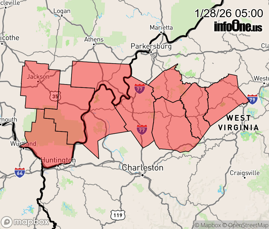 Canceled 1/28/26 10:55 AM Cold Weather Advisory issued January 28 at 4:58AM EST until January 28 at 11:00AM EST by NWS Charleston WV * WHAT... Very cold wind chills as low as 9 below. * WHERE... In Ohio, Gallia, Jackson OH, Lawrence OH, and Meigs Counties. In West Virginia, Calhoun, Gilmer, Jackson WV, Roane, Wirt, and Mason Counties. * WHEN... Until 11 AM EST this morning. * IMPACTS... The cold wind chills as low as 10 below zero could result in hypothermia if precautions are not taken. ![]() |