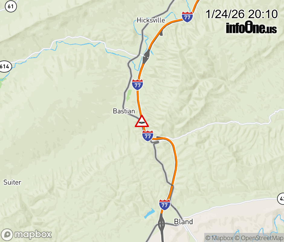 On I-77 at mile marker 56.9 in the County of Bland, motorists can expect delays due to a tractor trailer crash. The south right shoulder is closed. Updated: Sat 1/24/26 8:10 PM EST ![]() Updated: Sat 1/24/26 8:10 PM EST |