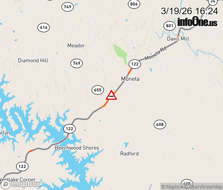 On VA-122 North in the County of Bedford, in the vicinity of Diamond Hill Rd; Rt. 655E (Bedford County); / DIAMOND HILL RD, motorists can expect delays due to a vehicle crash. Lane closures exist. ![]() |