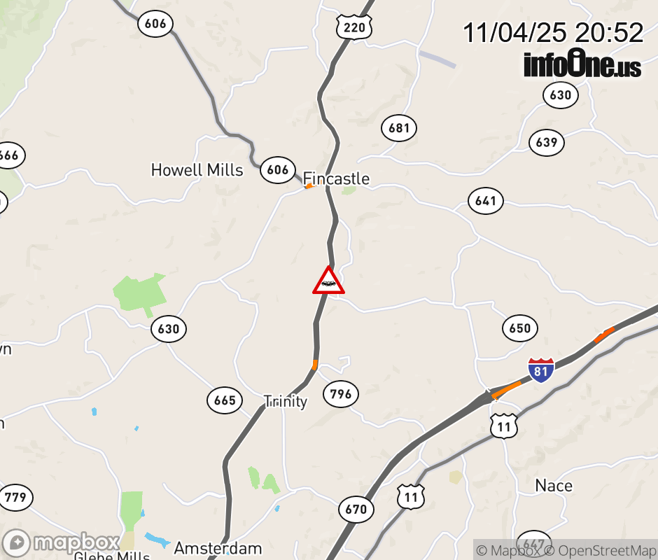 On US-220 in the County of Botetourt, in the vicinity of Brughs Mill Rd; Rt. 640E/W (Botetourt County), motorists can expect delays due to a vehicle crash. The north right lane and right shoulder are closed. ![]() |