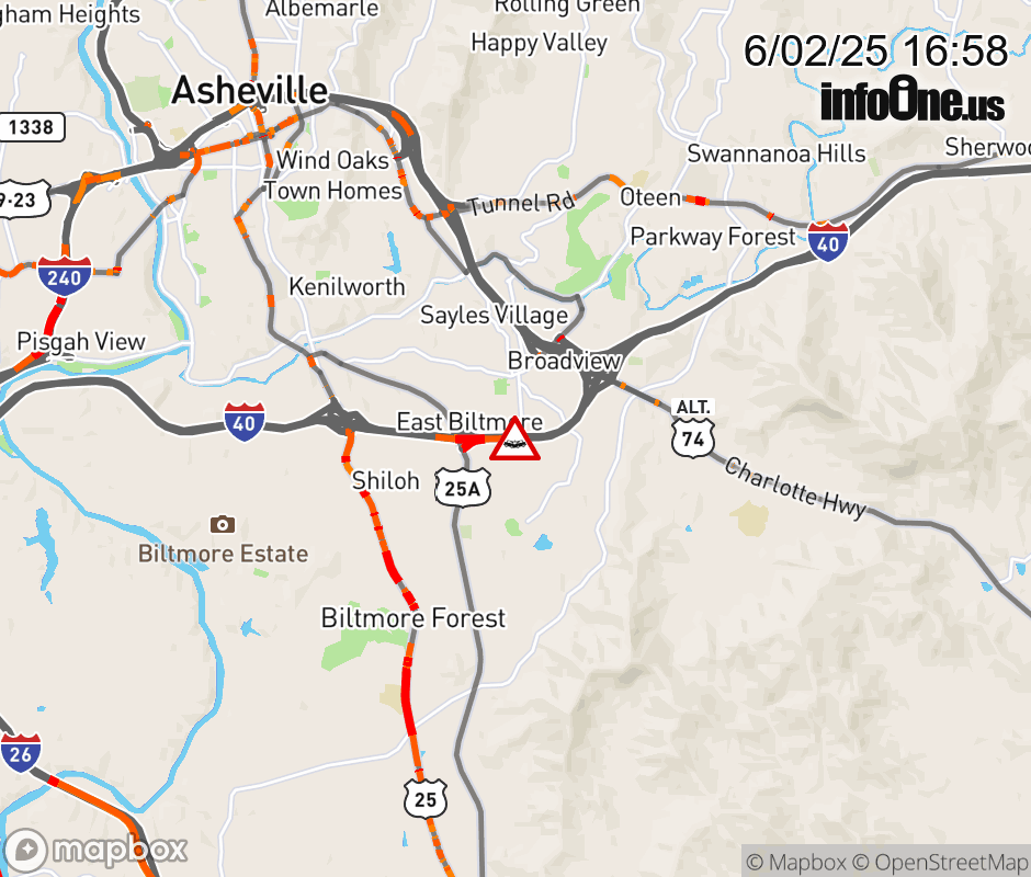 The right shoulder is closed after Exit 51, US-25A (Sweeten Creek Road). Updated: Mon 6/2/25 4:58 PM EDT ![]() Updated: Mon 6/2/25 4:58 PM EDT |