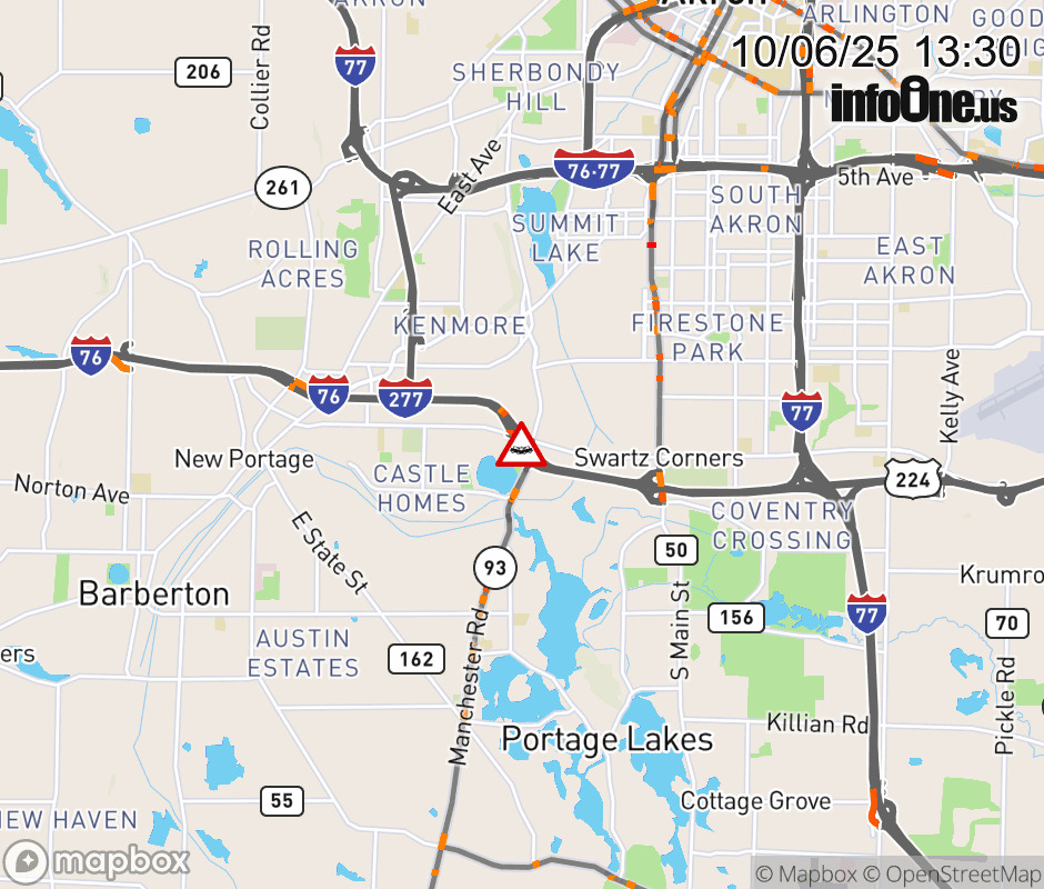 The right lane is blocked on I-277/US-224 West beyond SR-93/Manchester Rd/Waterloo Rd, due to a crash. Updated: Mon 10/6/25 1:30 PM EDT ![]() Updated: Mon 10/6/25 1:30 PM EDT |