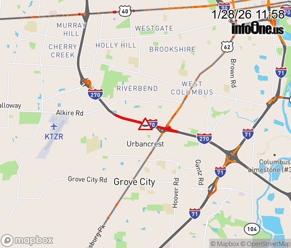 The left lane is blocked on I-270 West beyond US-62/Harrisburg Pike, due to a crash. Updated: Wed 1/28/26 11:58 AM EST ![]() Updated: Wed 1/28/26 11:58 AM EST |