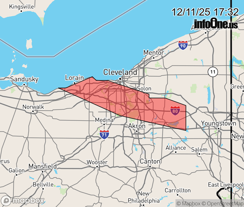 Canceled 12/11/25 7:00 PM Special Weather Statement issued December 11 at 5:30PM EST by NWS Cleveland OH At 529 PM EST, radar indicated an intense lake effect snow band along a line extending from 9 miles north of Western Vermilion to near Garrettsville. HAZARDS INCLUDE... Visibility rapidly dropping to less than a quarter of a mile... Locations impacted include... Cleveland, Lorain, Elyria, Ravenna, Vermilion, Parma, Lakewood, Cuyahoga Falls, Strongsville, Brunswick, Westlake, North Royalton, North Ridgeville, Kent, Solon, Avon Lake, Hudson, Twinsburg, Streetsboro, and Amherst. Use extra caution if you must travel into or through this lake effect snow band. Rapid changes in visibility and potentially slick roads are likely to lead to accidents. Consider delaying travel until this snow band passes your location. ![]() |