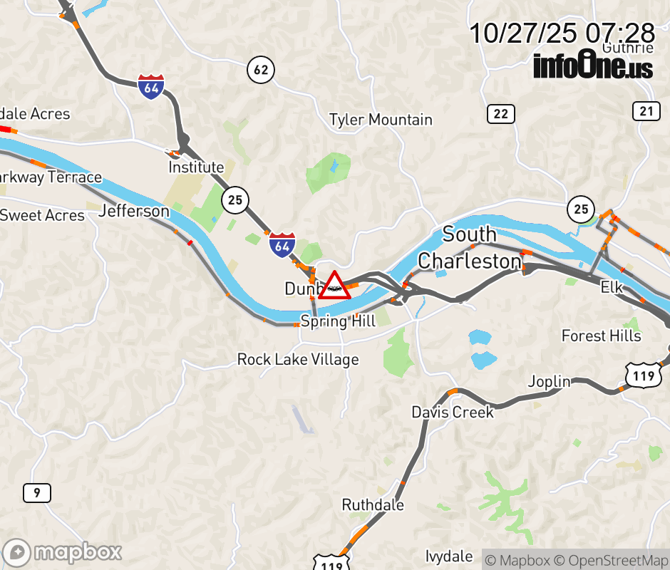 Vehicle Crash on WV-25 (10th St) & I-64W MM 53 Ramp in Dunbar. The northbound road is closed. The southbound road is closed. Updated: Mon 10/27/25 7:28 AM EDT ![]() Updated: Mon 10/27/25 7:28 AM EDT |