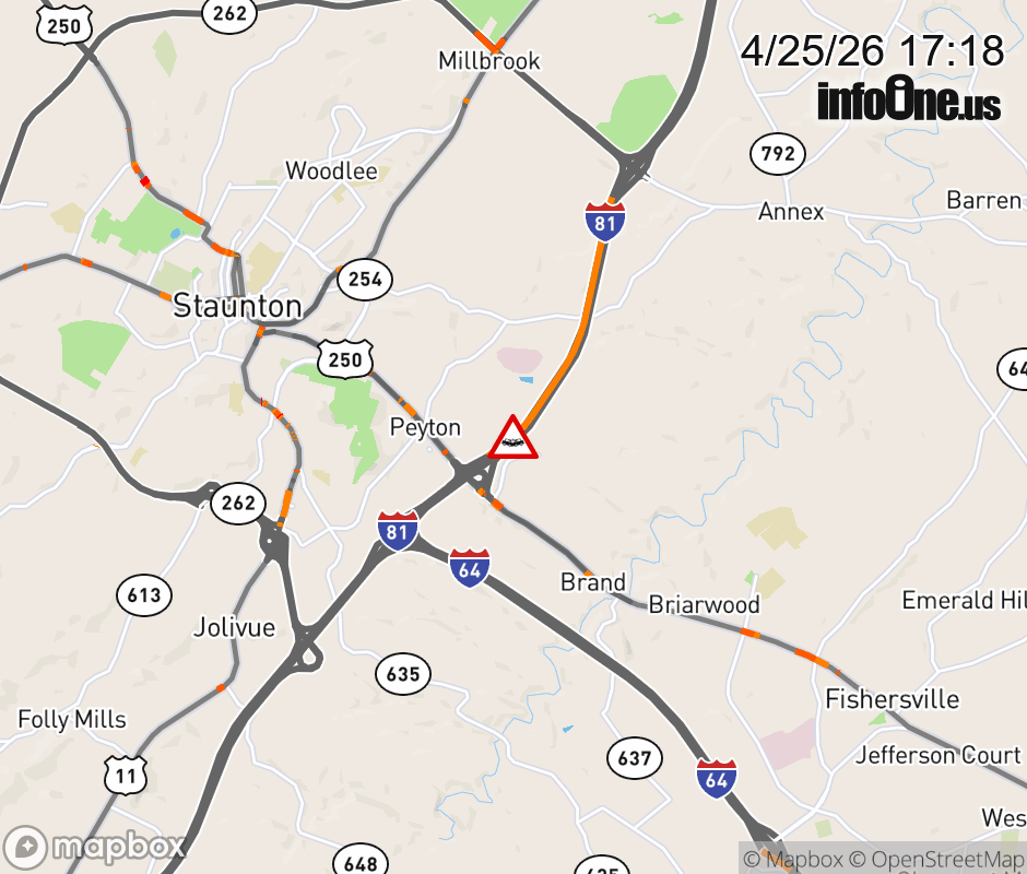 On I-81 South at mile marker 223.1 in the County of Augusta, motorists can expect delays due to a vehicle crash. Updated: Sat 4/25/26 5:18 PM EDT ![]() Updated: Sat 4/25/26 5:18 PM EDT |