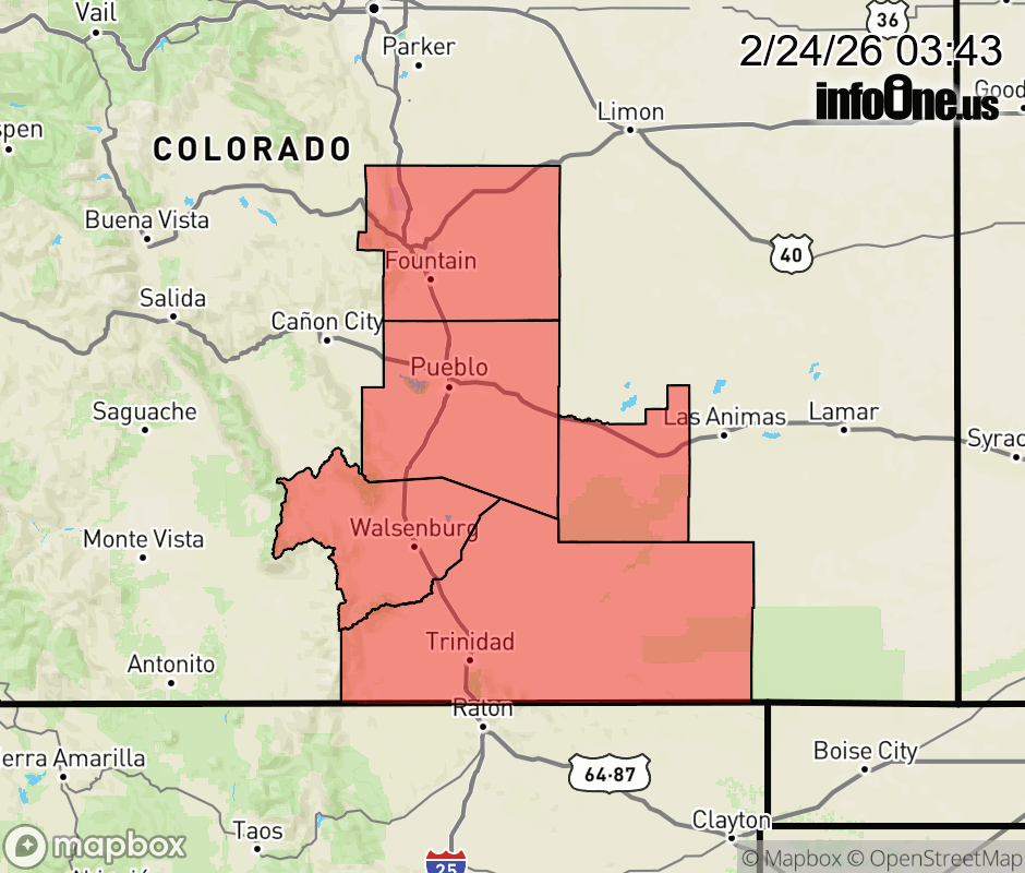 Canceled 2/24/26 1:49 PM Red Flag Warning issued February 24 at 1:42AM MST until February 24 at 6:00PM MST by NWS Pueblo CO * AFFECTED AREA... Fire Weather Zones 227, 228, 229, 230, 232 and 233. * WINDS... West 15 to 25 mph with gusts up to 35 mph today and west 20 to 30 mph with gusts up to 45 mph on Wednesday. * RELATIVE HUMIDITY... 5 to 10 percent Today, 12 to 15 percent possible on Wednesday. * IMPACTS... Elevated fire danger is expected. Fires will catch and spread rapidly and erratically. ![]() |