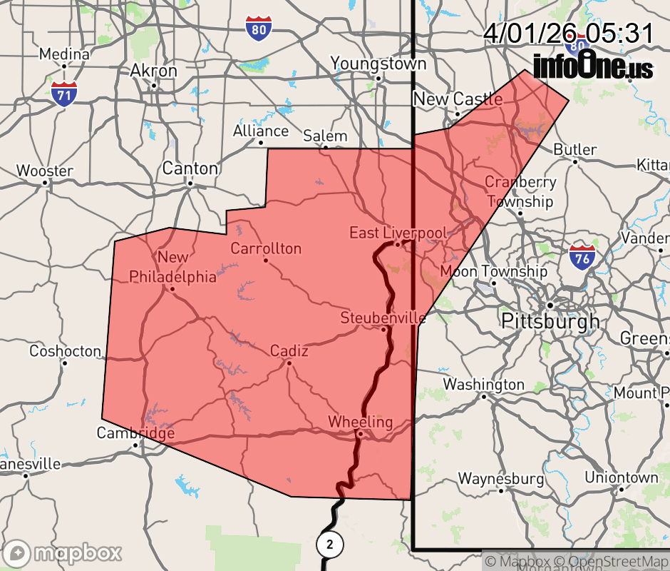 Canceled 4/1/26 10:55 AM Flood Warning issued April 1 at 5:30AM EDT until April 1 at 11:00AM EDT by NWS Pittsburgh PA * WHAT... Flooding caused by excessive rainfall is expected. * WHERE... Belmont County in east central Ohio... Carroll County in east central Ohio... Columbiana County in east central Ohio... Southeastern Coshocton County in east central Ohio... Northern Guernsey County in east central Ohio... Harrison County in east central Ohio... Jefferson OH County in east central Ohio... Tuscarawas County in east central Ohio... Southern Mercer County in northwestern Pennsylvania... Northwestern Washington County in southwestern Pennsylvania... Northwestern Butler County in west central Pennsylvania... Beaver County in western Pennsylvania... Southern Lawrence County in western Pennsylvania... Brooke County in northern West Virginia... Hancock County in northern West Virginia... Marshall County in northern West Virginia... Ohio County in northern West Virginia... * WHEN... Until 1100 AM EDT. * IMPACTS... Flooding of rivers, creeks, streams, and other low-lying and flood-prone locations is imminent or occurring. * ADDITIONAL DETAILS... - At 530 AM EDT, Doppler radar and automated rain gauges indicated heavy rain. Flooding is ongoing or expected to begin shortly in the warned area. Between 0.5 and 1.5 inches of rain have fallen. - Some locations that will experience flooding include... Wheeling, New Castle, Weirton, Steubenville, New Philadelphia, Dover, Salem, East Liverpool, Moundsville, Beaver Falls, Martins Ferry, Columbiana, Monaca, Uhrichsville, St. Clairsville, East Palestine, Bellaire, Barnesville, Wellsville and Cadiz. - http://www.weather.gov/safety/flood ![]() |