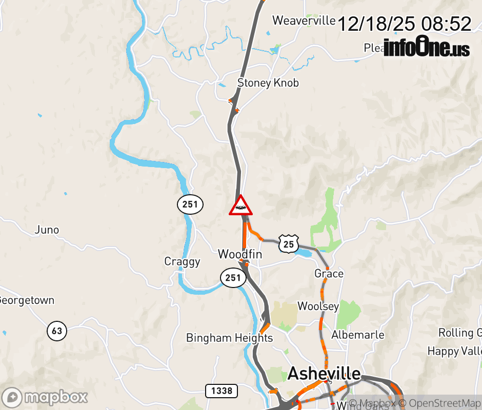 The right shoulder is closed at Exit 23, US 25 (Weaverville Road)