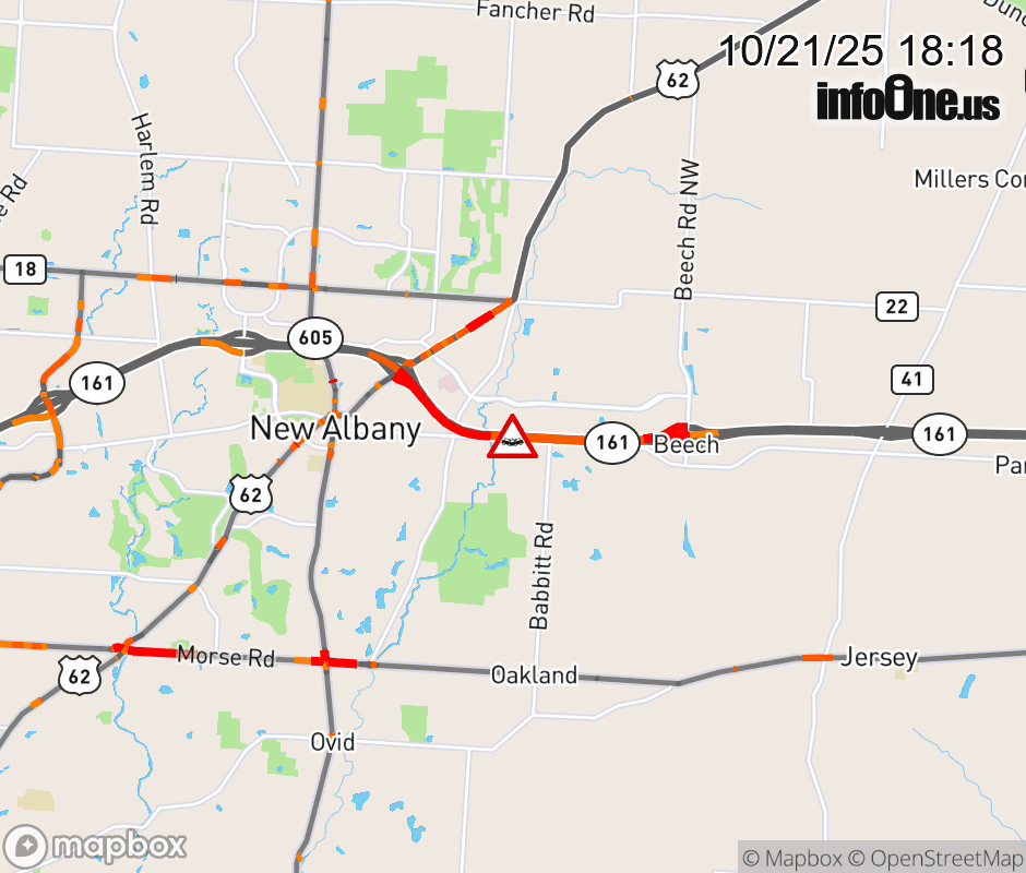 Expect lane closures on SR-161 in both directions 1.4 miles beyond US-62. (MM: 22.9), due to crash. Updated: Tue 10/21/25 6:18 PM EDT ![]() Updated: Tue 10/21/25 6:18 PM EDT |