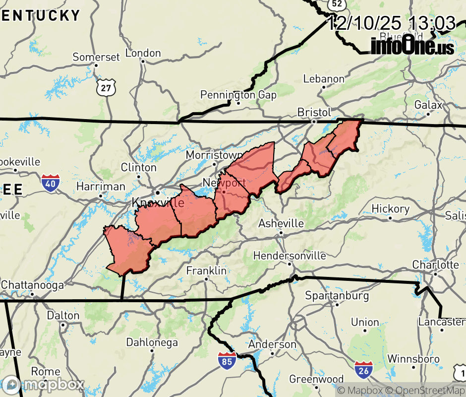 Canceled 12/10/25 5:22 PM Wind Advisory issued December 10 at 1:01PM EST until December 11 at 1:00AM EST by NWS Morristown TN * WHAT... West winds 15 to 30 mph with gusts up to 50 mph. * WHERE... Blount Smoky Mountains, Cocke Smoky Mountains, Johnson, Sevier Smoky Mountains, Southeast Carter, Southeast Greene, Southeast Monroe, and Unicoi Counties. * WHEN... Until 1 AM EST Thursday. * IMPACTS... Gusty winds will blow around unsecured objects. Tree limbs could be blown down and a few power outages may result. ![]() |