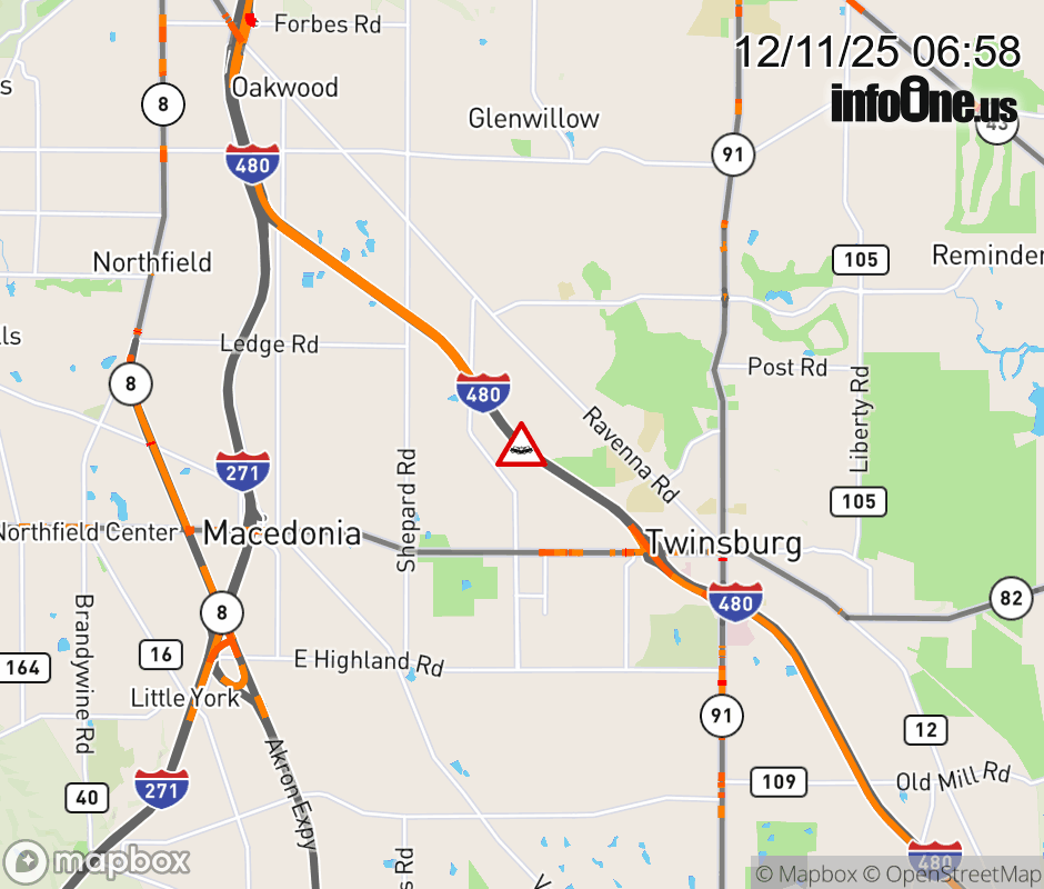 Expect lane closures on I-480/SR-14 West beyond SR-82/E Aurora Rd, due to a crash. Updated: Thu 12/11/25 6:58 AM EST ![]() Updated: Thu 12/11/25 6:58 AM EST |