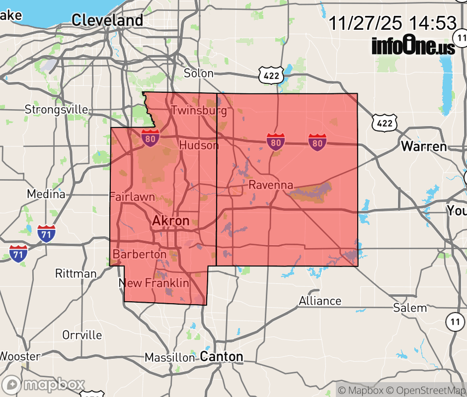 Canceled 11/27/25 5:51 PM Winter Weather Advisory issued November 27 at 2:51PM EST until November 28 at 7:00PM EST by NWS Cleveland OH * WHAT... Lake effect snow occurring. Additional snow accumulations of 3 to 6 inches in northern Summit County and northern Portage County. Amounts will decrease farther south across the area. Winds gusting as high as 35 mph. * WHERE... Summit, Portage and Trumbull counties. * WHEN... Until 7 PM EST Friday. * IMPACTS... Travel could be very difficult due to periods of snow covered roads and reduced visibility in lake effect snow. * ADDITIONAL DETAILS... The heaviest snow is expected tonight into early Friday as snow bands sag south into the area from the north. Snowfall rates will likely reach 1 inch per hour at times within bands tonight. Locally higher totals are possible in northern Portage County, and a Lake Effect Snow Warning may be needed if these become more likely. ![]() |