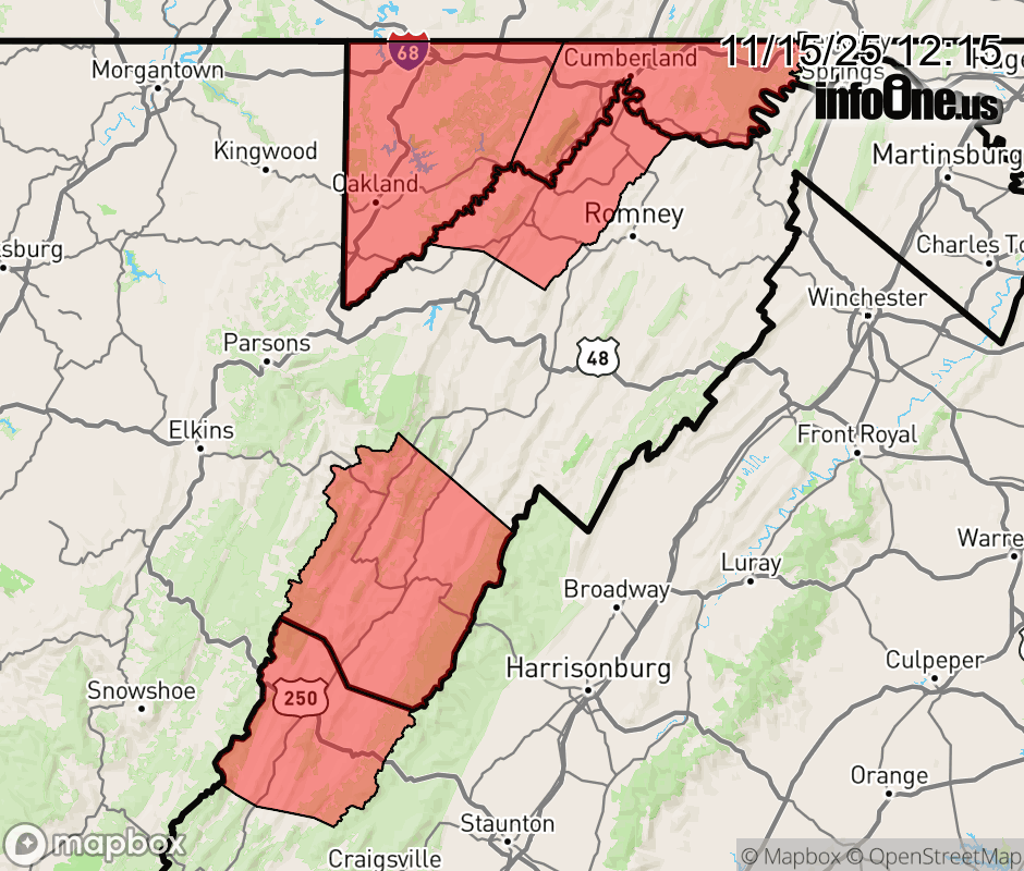 Canceled 11/15/25 12:52 PM Wind Advisory issued November 15 at 12:14PM EST until November 16 at 6:00PM EST by NWS Baltimore MD/Washington DC * WHAT... Northwest winds 15 to 25 mph with gusts up to 50 mph expected. * WHERE... In Maryland, Eastern Garrett and Extreme Western Allegany Counties. In Virginia, Highland County. In West Virginia, Eastern Pendleton and Western Mineral Counties. * WHEN... From 6 AM to 6 PM EST Sunday. * IMPACTS... Gusty winds will blow around unsecured objects. Tree limbs could be blown down and a few power outages may result. ![]() |
