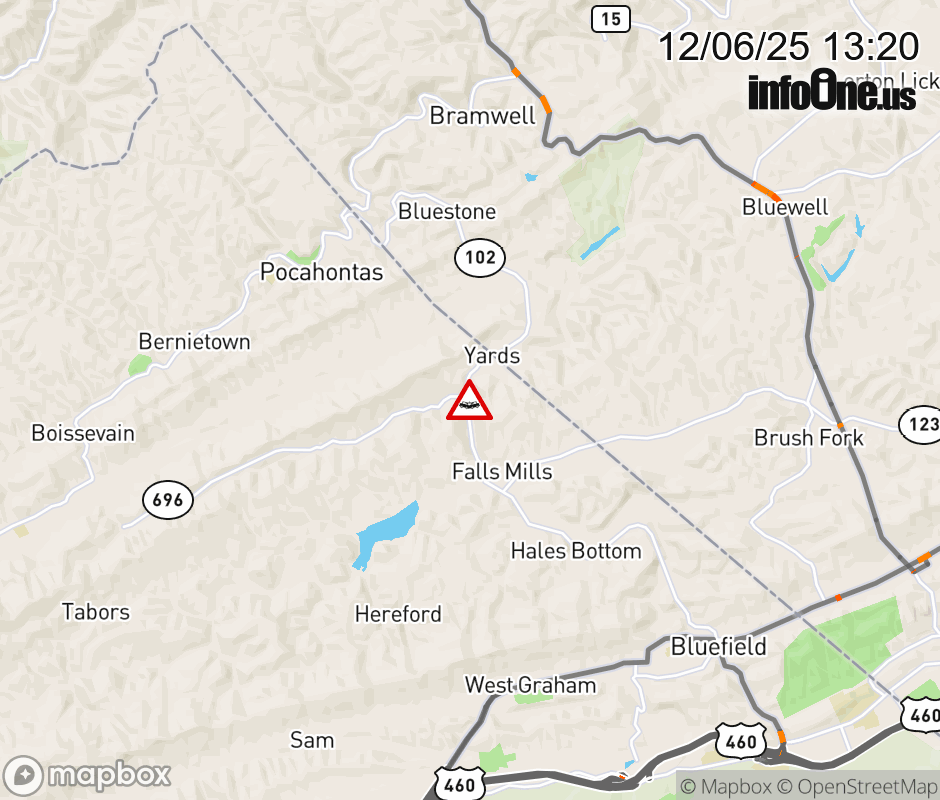 On Rt. 696 East in the County of Tazewell, in the vicinity of Big Branch Rd; Dead End, motorists can expect delays due to a vehicle crash. Lane closures exist. ![]() |