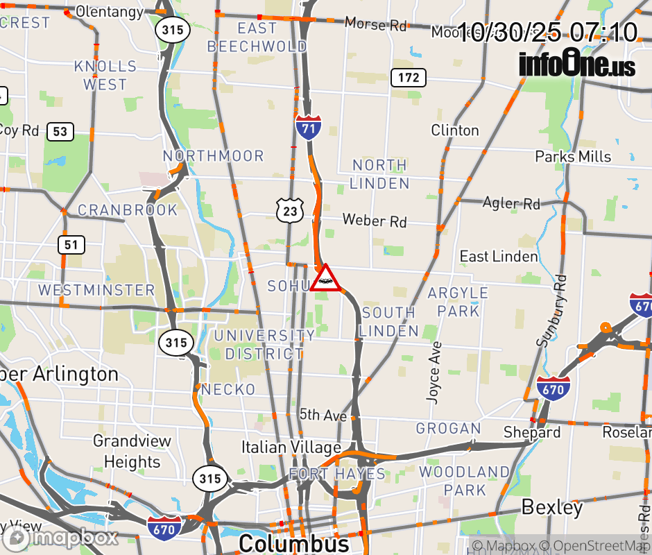 The left lane is blocked on I-71 South beyond Hudson St, due to a crash. Updated: Thu 10/30/25 7:10 AM EDT ![]() Updated: Thu 10/30/25 7:10 AM EDT |