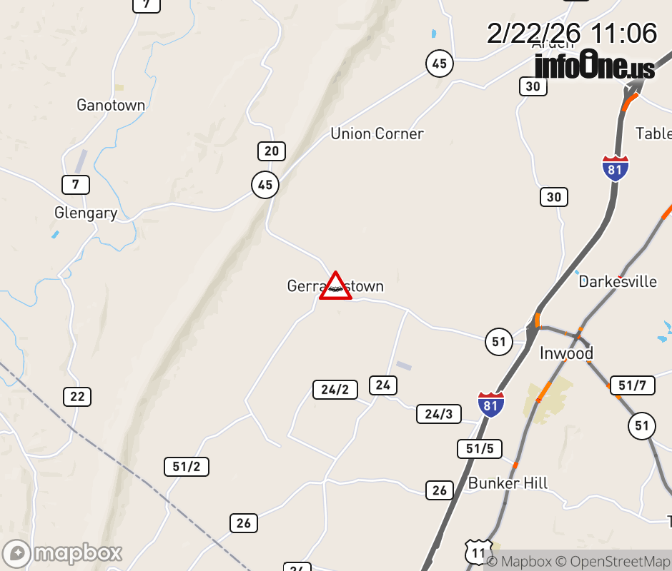 Vehicle Crash on WV-51 (Gerrardstown Rd) & CR-51/2 (Dominion Rd) in Gerrardstown. ![]() |