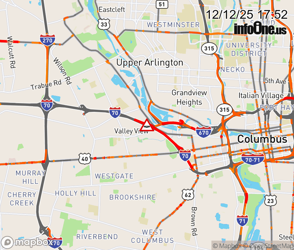 The right shoulder is blocked on I-670 West beyond US-33, due to a crash. Updated: Fri 12/12/25 5:52 PM EST ![]() Updated: Fri 12/12/25 5:52 PM EST |