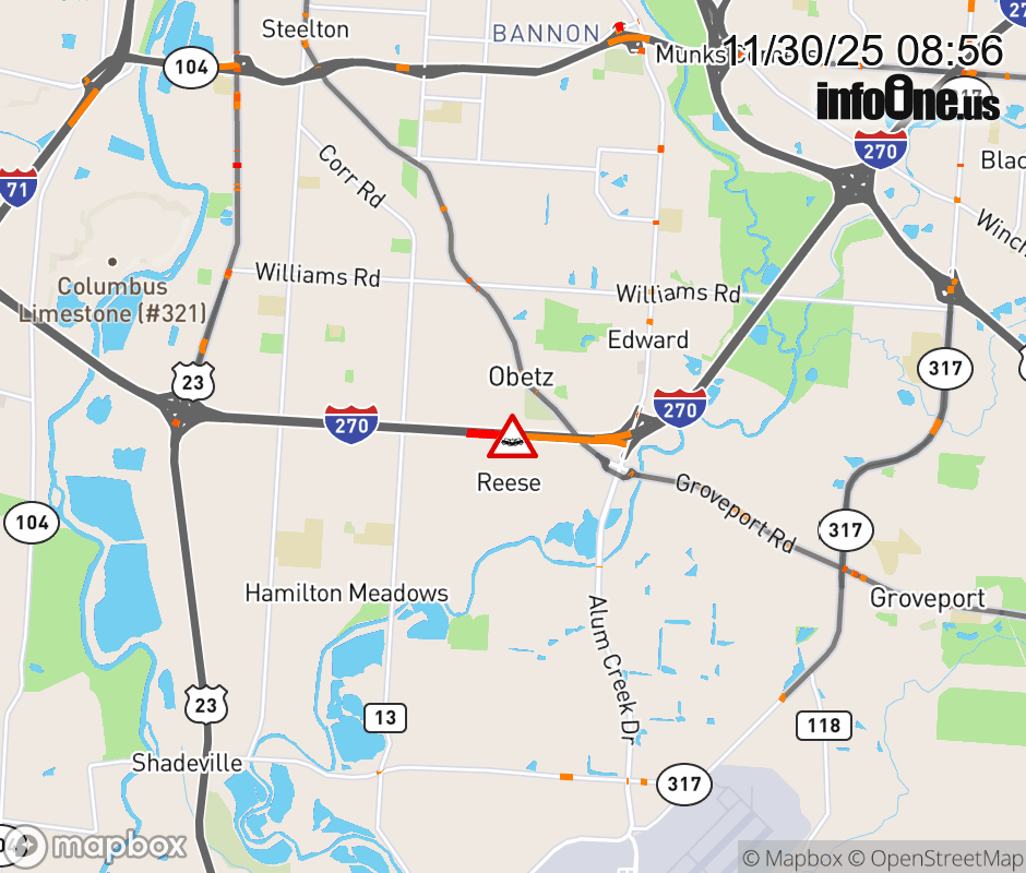 The right lane is closed on I-270 East beyond US-23/S High St North, due to a crash. Updated: Sun 11/30/25 8:56 AM EST ![]() Updated: Sun 11/30/25 8:56 AM EST |