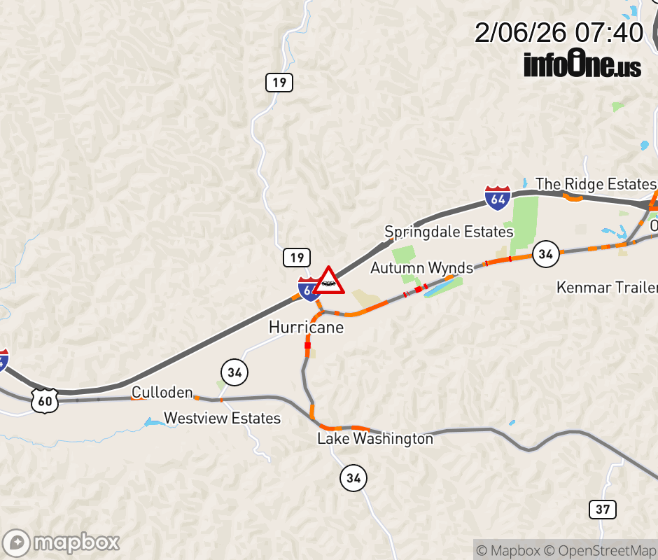 Vehicle Crash on I-64W at Mile Marker 34.0. The westbound left lane is closed. Comments:Area of Hurricane Exit. Median Side. Updated: Fri 2/6/26 7:40 AM EST ![]() Updated: Fri 2/6/26 7:40 AM EST |