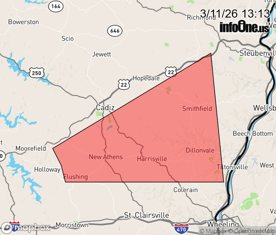 Canceled 3/11/26 1:26 PM Tornado Warning issued March 11 at 1:12PM EDT until March 11 at 1:30PM EDT by NWS Pittsburgh PA TORPBZ The National Weather Service in Pittsburgh has issued a * Tornado Warning for... Northeastern Belmont County in east central Ohio... Southeastern Harrison County in east central Ohio... Southwestern Jefferson OH County in east central Ohio... * Until 130 PM EDT. * At 112 PM EDT, a severe thunderstorm capable of producing a tornado was located 6 miles south of Cadiz, moving east at 45 mph. HAZARD...Tornado. SOURCE...Radar indicated rotation. IMPACT...Flying debris will be dangerous to those caught without shelter. Mobile homes will be damaged or destroyed. Damage to roofs, windows and vehicles will occur. Tree damage is likely. * Locations impacted include... Cadiz, Flushing, Smithfield, Adena, Dillonvale, Mount Pleasant, New Athens, Harrisville and Newell. ![]() |