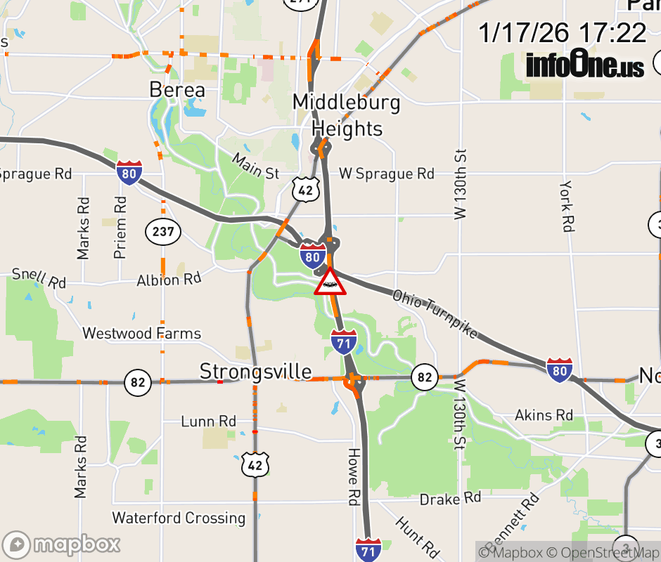 The left lane is blocked on I-71 South beyond I-80/Ohio Turnpike, due to a crash. ![]() |