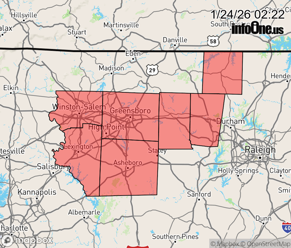 Canceled 1/24/26 3:18 PM Winter Storm Warning issued January 24 at 2:21AM EST until January 26 at 1:00PM EST by NWS Raleigh NC * WHAT... Heavy mixed precipitation expected. Total ice accumulations ranging from one quarter to one half of an inch. Locally higher ice amounts approaching three quarters of an inch are also possible. Sleet and snow accumulations between 1 and 3 inches. * WHERE... A portion of central North Carolina. * WHEN... From 1 PM this afternoon to 1 PM EST Monday. * IMPACTS... Significant ice accumulation on power lines and tree limbs may cause widespread and long-lasting power outages. Travel could be treacherous. The hazardous conditions could impact the Monday morning commute. ![]() |