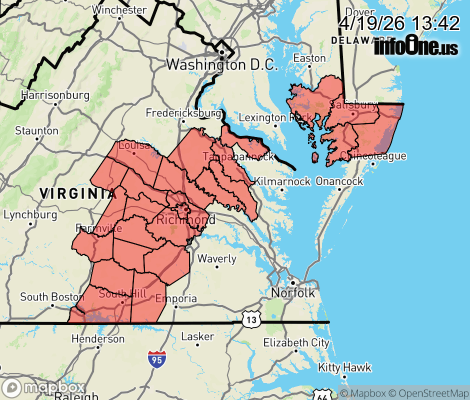 Canceled 4/19/26 8:11 PM Freeze Watch issued April 19 at 1:41PM EDT until April 21 at 9:00AM EDT by NWS Wakefield VA * WHAT... Sub-freezing temperatures as low as 28 to 32 degrees possible. The best freeze potential is away from the immediate coastline. * WHERE... Portions of southeast Maryland and central, east central, north central, and south central Virginia. * WHEN... From late Monday night through Tuesday morning. * IMPACTS... Frost and freeze conditions could kill crops, other sensitive vegetation and possibly damage unprotected outdoor plumbing. ![]() |
