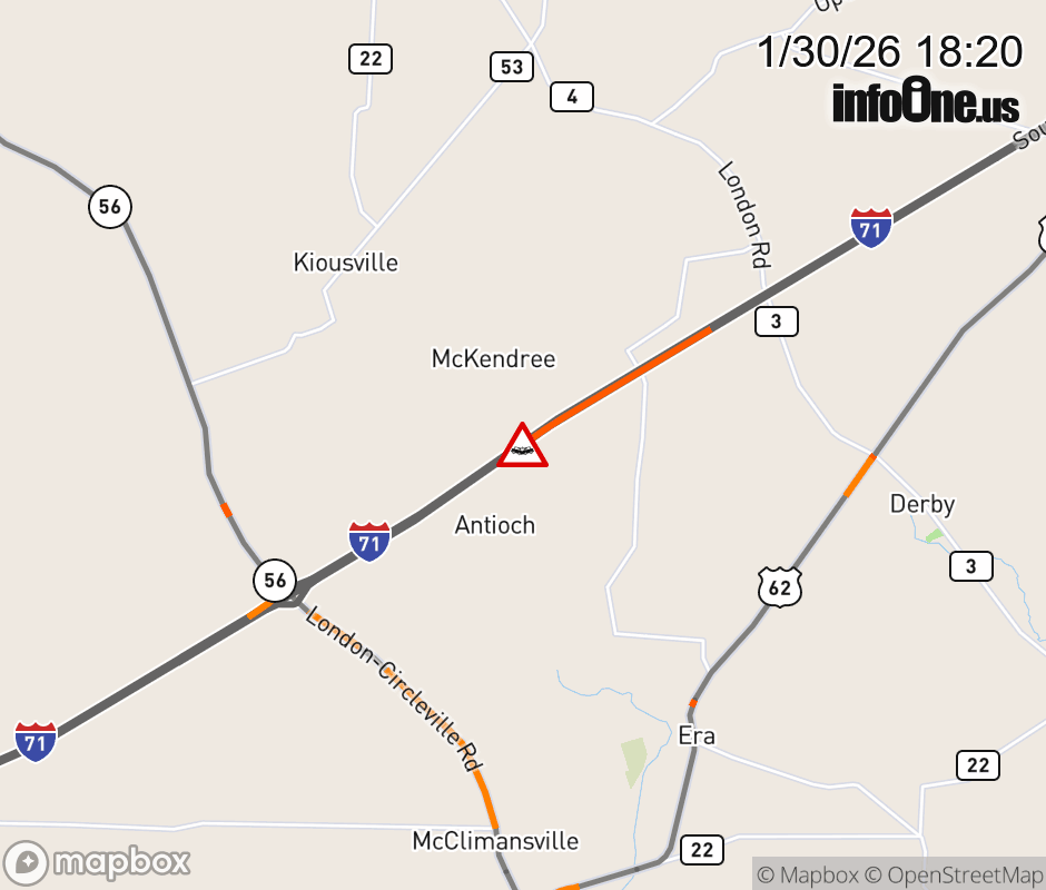 Expect lane closures on I-71 North beyond SR-56/London/Mt Sterling, due to a crash. ![]() |