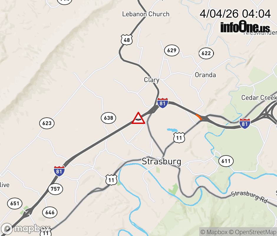 On I-81 at mile marker 296 in the County of Shenandoah, motorists can expect delays due to a vehicle crash. The south entrance ramp narrows. Updated: Sat 4/4/26 4:04 AM EDT ![]() Updated: Sat 4/4/26 4:04 AM EDT |