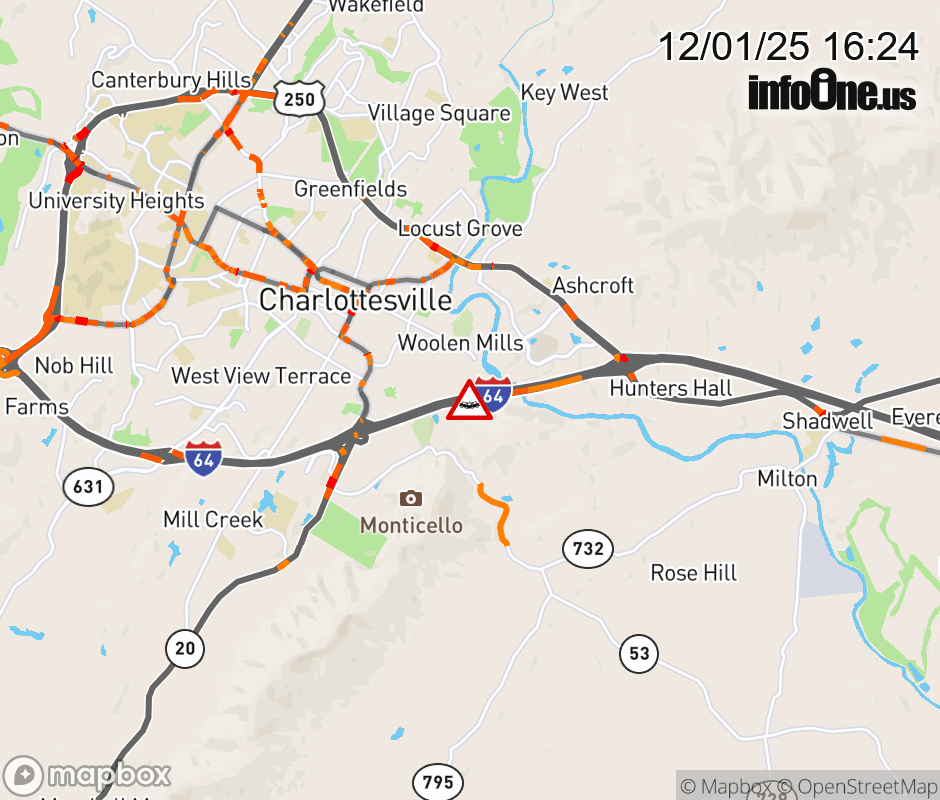 On I-64 East at mile marker 123 in the County of Albemarle, motorists can expect delays due to a tractor trailer crash. Traffic backups are approximately 1.0 mile. Updated: Mon 12/1/25 4:24 PM EST ![]() Updated: Mon 12/1/25 4:24 PM EST |