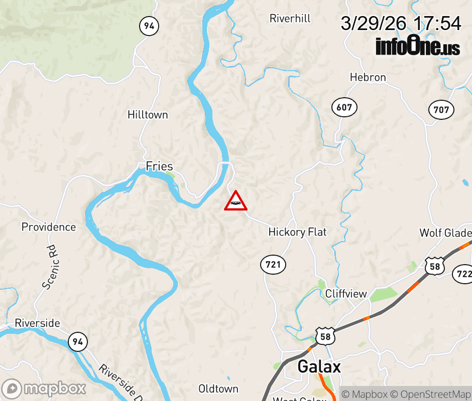 On Rt. 721 East in the County of Carroll, in the vicinity of Dixon Rd; Fries Rd; Rt. 606N/S (Carroll County), motorists can expect delays due to a vehicle crash. Lane closures exist. Updated: Sun 3/29/26 5:54 PM EDT ![]() Updated: Sun 3/29/26 5:54 PM EDT |