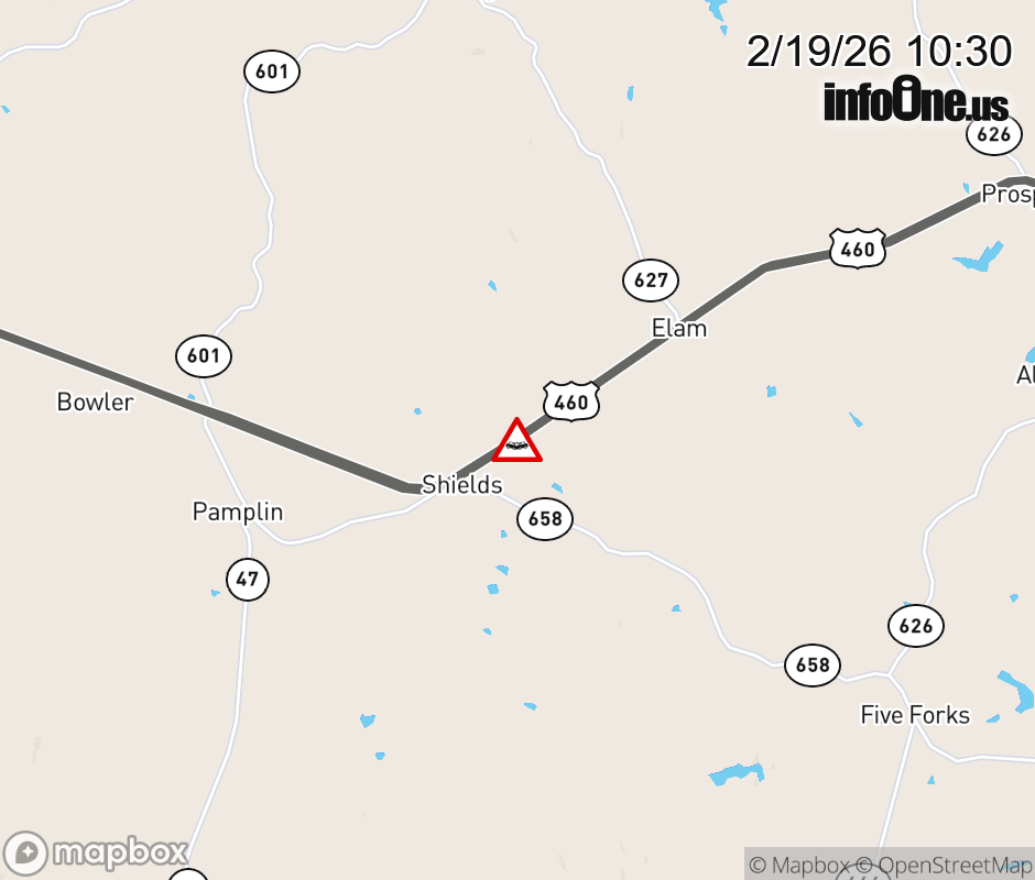 On US-460 East in the County of Prince Edward, in the vicinity of Five Forks Rd; Rt. 658E/W (Prince Edward County), motorists can expect delays due to a vehicle crash. Lane closures exist. ![]() |