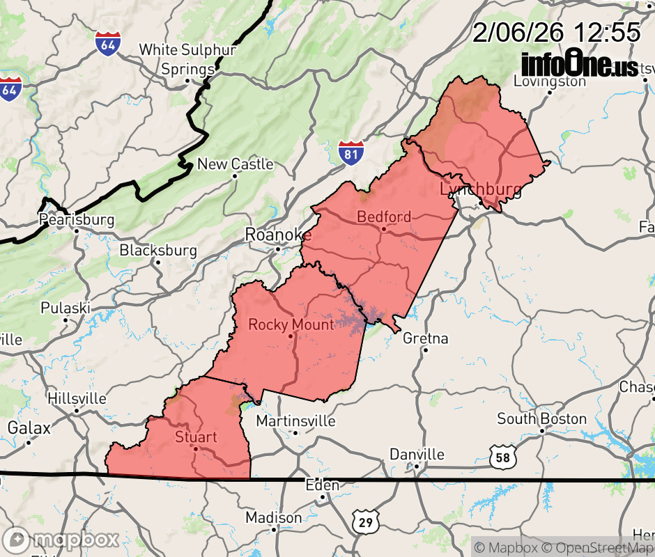 Canceled 2/6/26 7:40 PM Wind Advisory issued February 6 at 12:54PM EST until February 7 at 7:00PM EST by NWS Blacksburg VA * WHAT... For the Wind Advisory, northwest winds 20 to 30 mph with gusts up to 55 mph expected. For the Cold Weather Advisory, very cold wind chills as low as 9 below expected. * WHERE... Amherst, Bedford, Patrick, and Franklin Counties. * WHEN... For the Wind Advisory, from 7 PM this evening to 7 PM EST Saturday. For the Cold Weather Advisory, from 1 AM Saturday to 7 AM EST Sunday. * IMPACTS... Gusty winds will blow around unsecured objects. Tree limbs could be blown down and a few power outages may result. The cold wind chills as low as 9 below zero could result in hypothermia if precautions are not taken. ![]() |