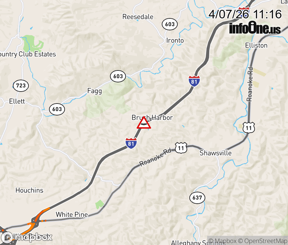 On I-81 at mile marker 123.2 in the County of Montgomery, motorists can expect delays due to a vehicle crash. The south right shoulder is closed. ![]() |
