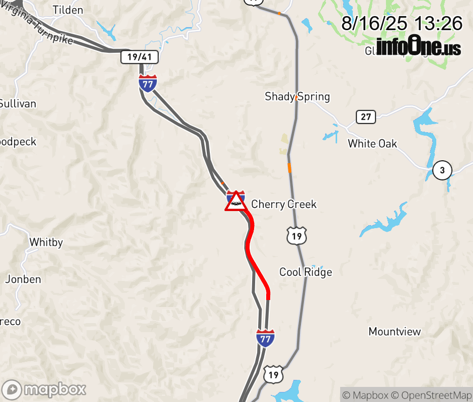 In Raleigh County there is a Vehicle Crash on I-77N Toll at Mile Marker 33.5. Updated: Sat 8/16/25 1:26 PM EDT ![]() Updated: Sat 8/16/25 1:26 PM EDT |