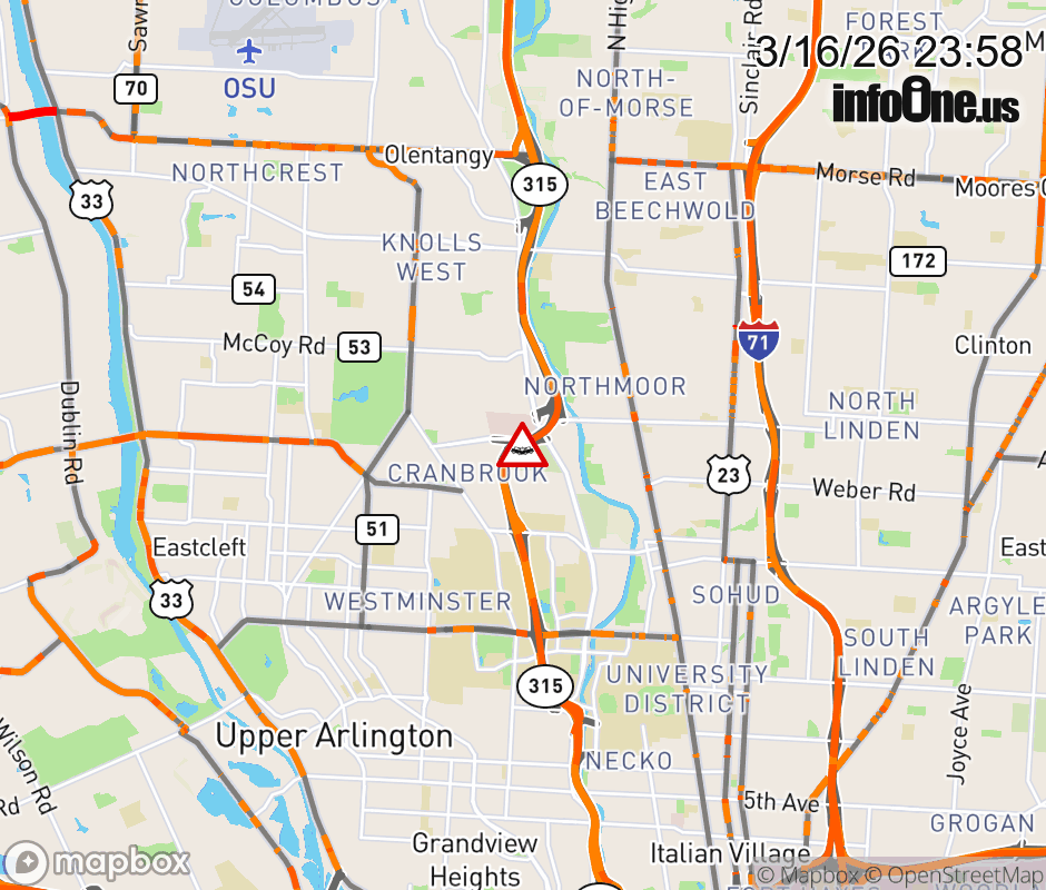 The 2 right lanes are blocked on SR-315 North beyond N Broadway/Olentangy River Rd, due to a crash. Updated: Mon 3/16/26 11:58 PM EDT ![]() Updated: Mon 3/16/26 11:58 PM EDT |