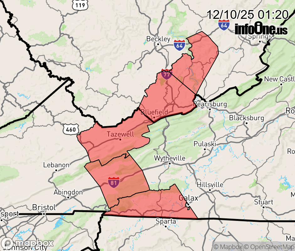 Canceled 12/10/25 12:00 PM Winter Weather Advisory issued December 10 at 1:19AM EST until December 11 at 10:00AM EST by NWS Blacksburg VA * WHAT... Snow and blowing snow. Total snow accumulation of 1 to 3 inches. Winds gusting as high as 40 mph. * WHERE... In Virginia, Grayson, Smyth, and Tazewell Counties. In West Virginia, Mercer and Summers Counties. * WHEN... From 1 PM this afternoon to 10 AM EST Thursday. * IMPACTS... Plan on slippery road conditions. The hazardous conditions could impact the Wednesday evening and Thursday morning commutes. * ADDITIONAL DETAILS... The snow may begin as rain. As temperatures fall this afternoon the rain is expected to change to snow with poor travel conditions expected tonight. ![]() |