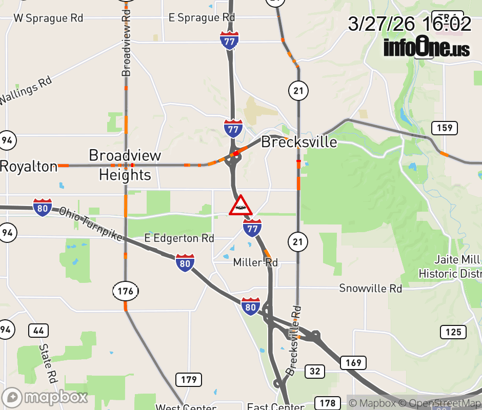 The 2 right lanes are blocked on I-77 North beyond I-80/Ohio Turnpike, due to a crash. Updated: Fri 3/27/26 4:02 PM EDT ![]() Updated: Fri 3/27/26 4:02 PM EDT |