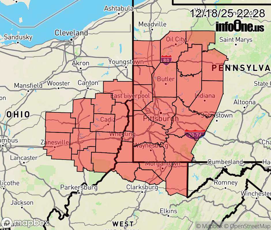 Canceled 12/19/25 5:00 AM Special Weather Statement issued December 18 at 10:26PM EST by NWS Pittsburgh PA A narrow line of convective showers associated with an advancing cold front will reach portions of eastern Ohio between 11pm EST Thursday to 2am EST Friday and western Pennsylvania plus northern West Virginia between 2am EST Friday to 430am EST Friday. West southwest wind gusts between 25 to 35 mph will be common but localized gusts of up to 50 mph may occur. Take time to secure any loose outdoor objects and use caution if driving high profile vehicles, especially along north to south oriented roadways. ![]() |