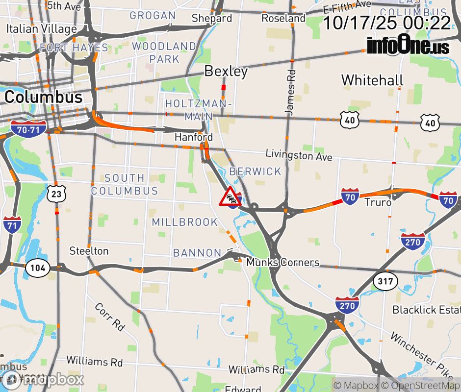 The 2 left lanes are blocked on I-70 West beyond US-33, due to repairs/maintenance. Updated: Fri 10/17/25 12:22 AM EDT ![]() Updated: Fri 10/17/25 12:22 AM EDT |