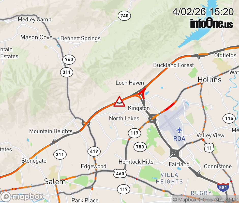 On I-81 North at mile marker 143 in the County of Roanoke, motorists can expect delays due to a tractor trailer crash. Traffic backups are approximately 1.0 mile. Updated: Thu 4/2/26 3:20 PM EDT ![]() Updated: Thu 4/2/26 3:20 PM EDT |