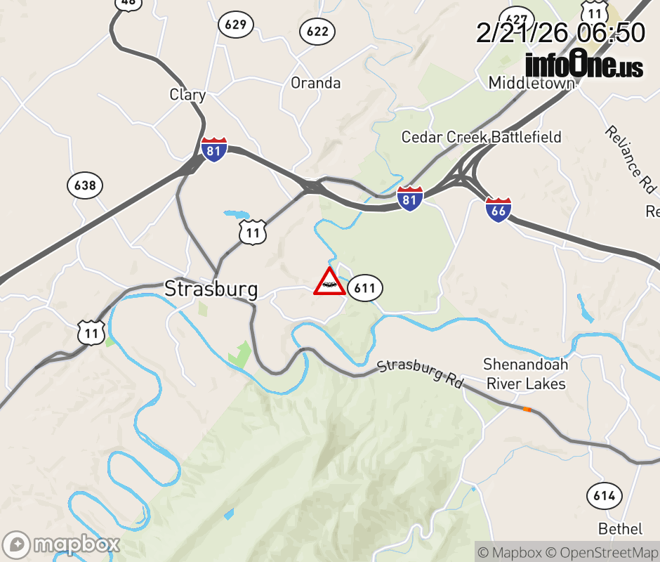 On Rt. 635 in the County of Shenandoah, in the vicinity of Pouts Hill Rd; Rt. 634E/W (Shenandoah County), motorists can expect delays due to a vehicle crash. All east lanes are closed. All west lanes are closed. Updated: Sat 2/21/26 6:50 AM EST ![]() Updated: Sat 2/21/26 6:50 AM EST |