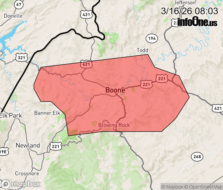 Canceled 3/16/26 8:25 AM Severe Thunderstorm Warning issued March 16 at 8:02AM EDT until March 16 at 8:45AM EDT by NWS Blacksburg VA SVRRNK The National Weather Service in BLACKSBURG has issued a * Severe Thunderstorm Warning for... Watauga County in northwestern North Carolina... * Until 845 AM EDT. * At 801 AM EDT, a severe thunderstorm was located over Sugar Mountain, or near Newland, moving east at 35 mph. HAZARD...60 mph wind gusts. SOURCE...Radar indicated. IMPACT...Expect damage to roofs, siding, and trees. * Locations impacted include... Boone... Blowing Rock... Beech Mountain... Foscoe... Sugar Grove... Deep Gap... and Todd. ![]() |