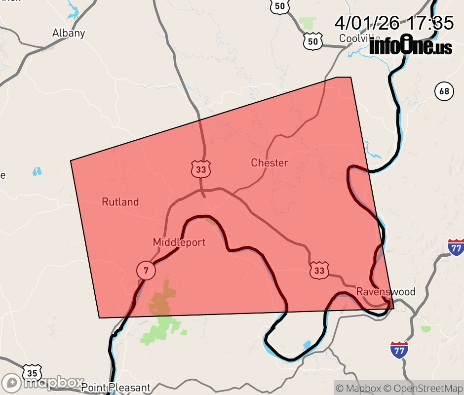 Canceled 4/1/26 6:00 PM Special Weather Statement issued April 1 at 5:33PM EDT by NWS Charleston WV At 533 PM EDT, Doppler radar was tracking a strong thunderstorm over Rutland, moving east at 20 mph. HAZARD...Wind gusts up to 40 mph and half inch hail. SOURCE...Radar indicated. IMPACT...Gusty winds could knock down tree limbs and blow around unsecured objects. Minor hail damage to vegetation is possible. Locations impacted include... Pomeroy, Racine, Rutland, Ravenswood, New Haven, Mason, Tuppers Plains, Middleport, Chester, Syracuse, Hartford City, Cheshire, Portland, Lakin, and Kyger. ![]() |